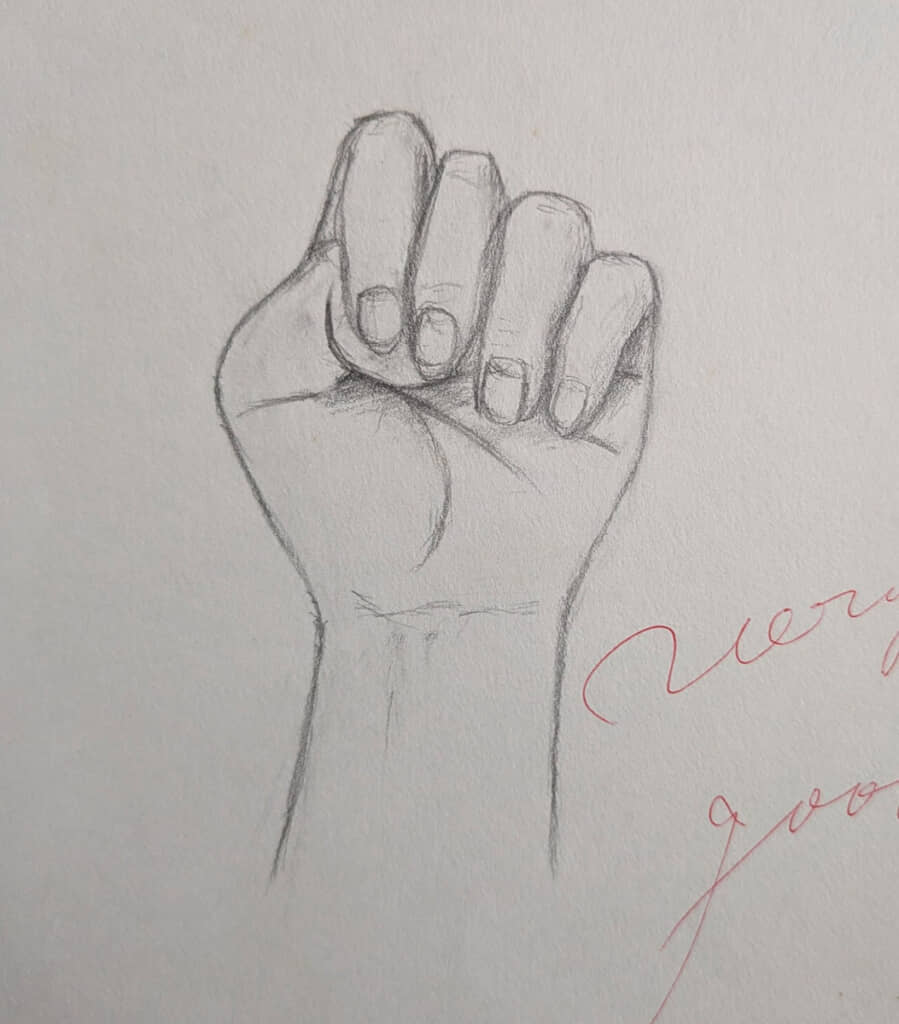中学時代の絵は、美術の授業でよくある「自分の手を描く」課題。素朴なタッチで握りこぶしを捉え、先生から「Verygood」と評価されています。