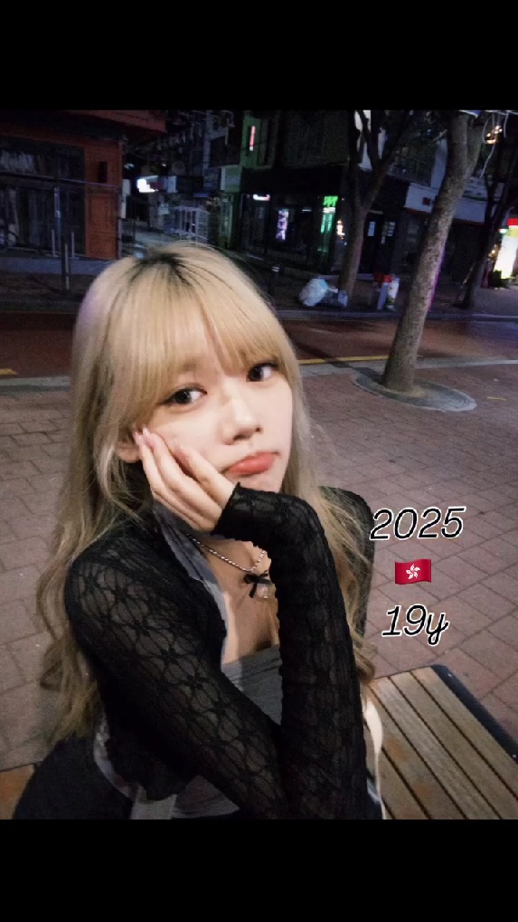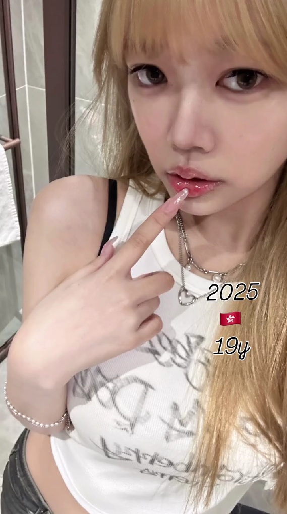 時が進み2025年現在になると、金髪に染めた19歳の投稿者さんが登場。白いタンクトップ姿で唇に指を添えたポーズの写真や、黒のレーストップをまとい、頬杖をついて見せる姿が映し出されます。