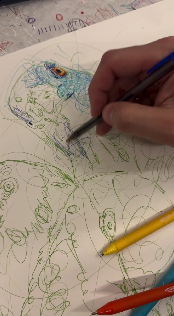 今回紹介するのは、ボールペンでぐるぐると無秩序に描かれたイラストの動画です。動画冒頭では、白い画用紙の上に緑や青のペンで無造作に線が描かれていきます。一見すると子どもの落書きのようにも見えますね。