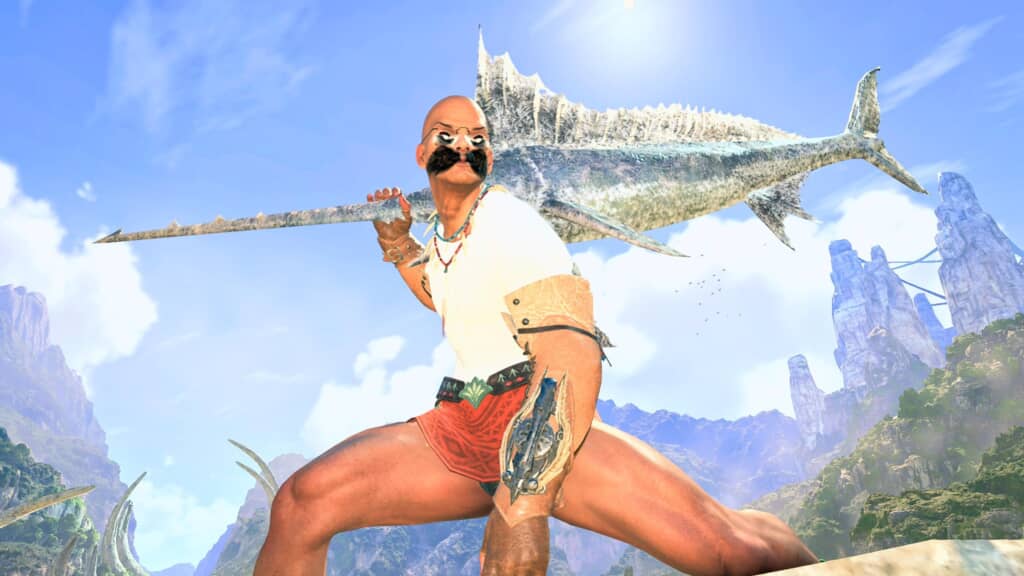 が、身体全体を見てみるとその印象は一変します。本来はギャグ漫画らしい2頭身のコミカルな風貌をしている「じーさん」ですが、再現されたキャラクターは筋骨隆々のたくましすぎる肉体をしており、まるでバトルマンガの登場人物。身長は主人公の活動をサポートする「アルマ」よりも高く、レイトウカジキを担いだ姿はあまりにも勇ましさにあふれています。