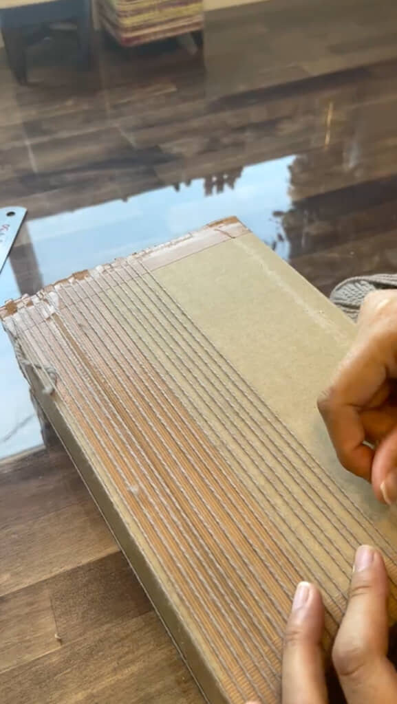 まずはダンボールにガムテープを貼り、しっかりと固定。端の方に等間隔に印をつけたら、カッターで切り込みを入れ、麻ひもを張っていきます。たったこれだけで、ダンボール箱の織り機ができました。
