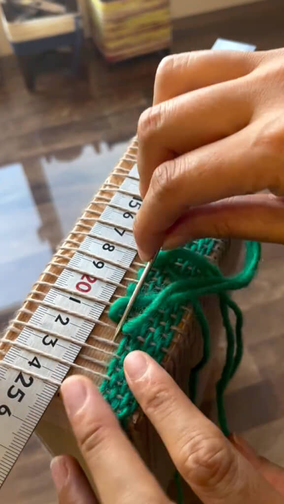 グリーンの毛糸を織っていく