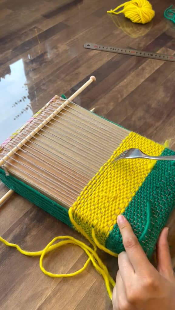 続いて、麻ひもにグリーンの毛糸を交互に入れていき、フォークで押さえながらどんどん織っていきます。ダンボール箱の織り機には、綜絖(そうこう/経糸の開口装置)がないため、ぼう針やものさしを挟みながら作業していきます。