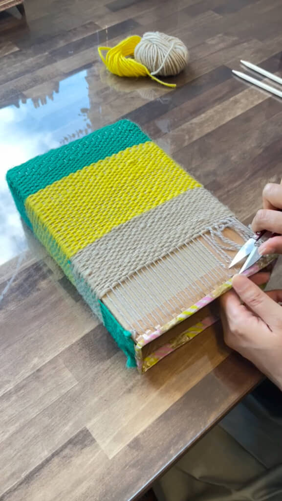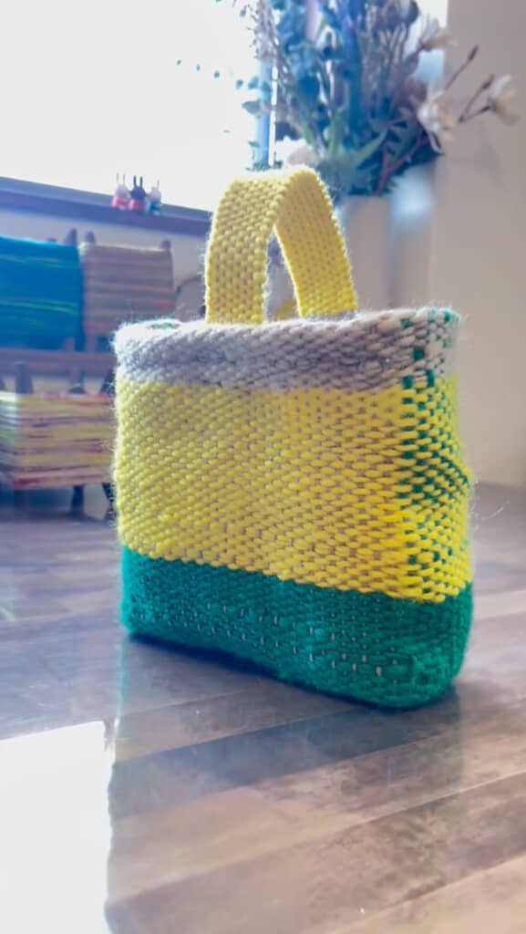数センチ織れたら、黄色の毛糸に変更し、さらに数センチ織ってベージュの毛糸に変更。そして、最後に織り機から取り外し、取っ手をつけたら……色鮮やかな夏色トートバッグが完成です!