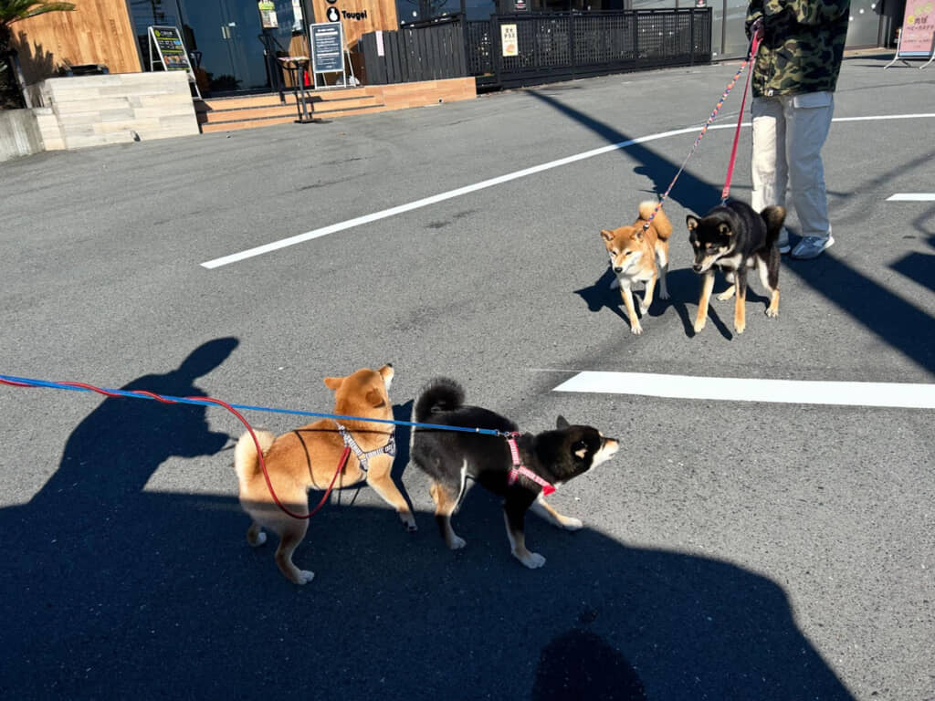 na1103koさんが連れている柴犬たちの正面には、よく似た色をした2匹の柴犬が……! 偶然にも自分と同じく、赤柴と黒柴を連れた飼い主さんとばったり遭遇したみたいです。