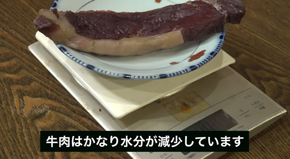さらに時間が経つと肉汁が漏れ出て、4時間経過するころにはビーフジャーキーのような見た目になりました。