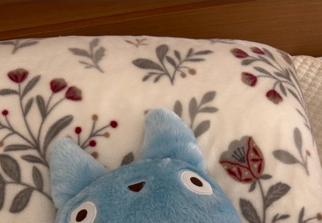 白地に花柄のクッションの上にいるのは青い毛を持つ中トトロ。依万理さんは娘ちゃんのために「中トトロさんには一肌脱いで頂きました」とコメントしていますが……。