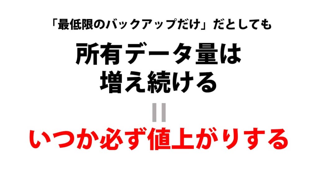 ですが、バックアップとはいわば「データの蓄積」。普段通りの使い方をしているだけでも、バックアップを定期的に行っていれば所有データ量は静かに増え続けているのです。容量上限があるサブスクストレージであればいつか必ず上限に達しますし、そうなればアップグレードが必要、すなわち月額料金が値上がりということになります。
