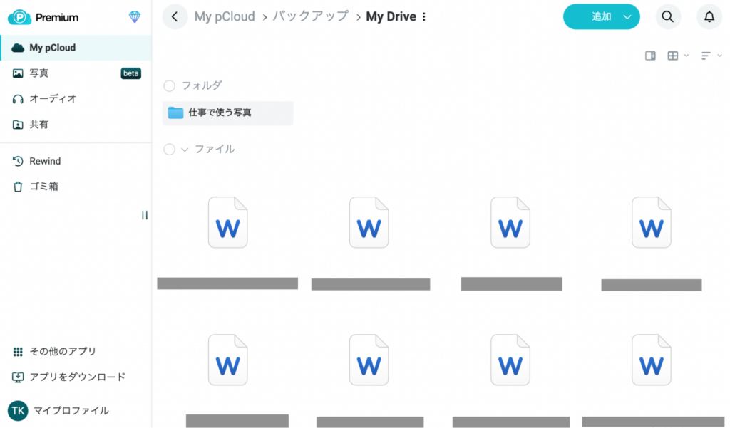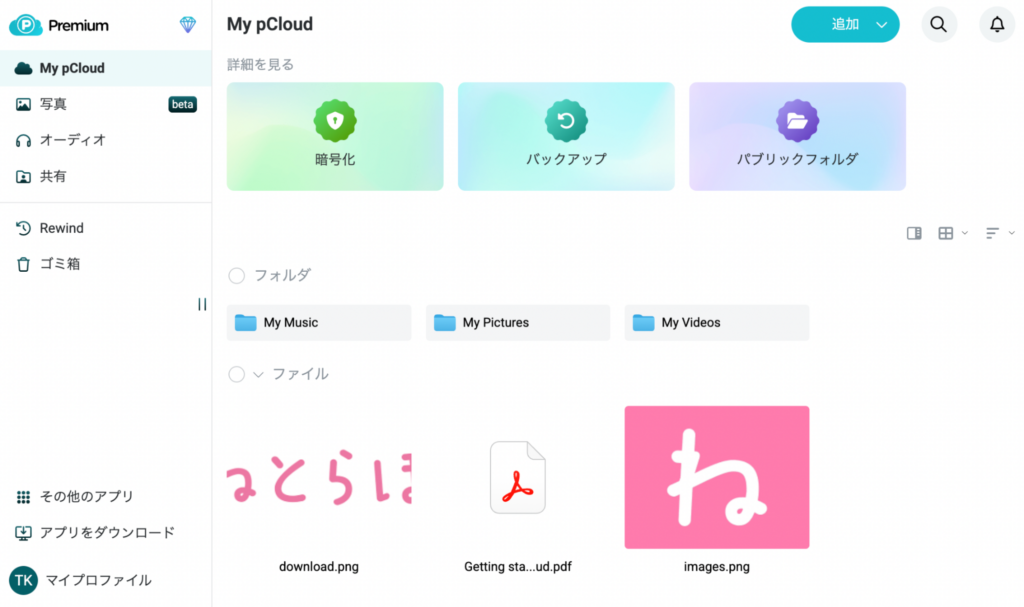 こちらは「pCloud」ストレージのメイン画面。すっきりと整理されたデザインで、どこに何があるかひと目でわかります。日本語表示にもしっかり対応しており、言語面での不自由さも感じませんでした。
