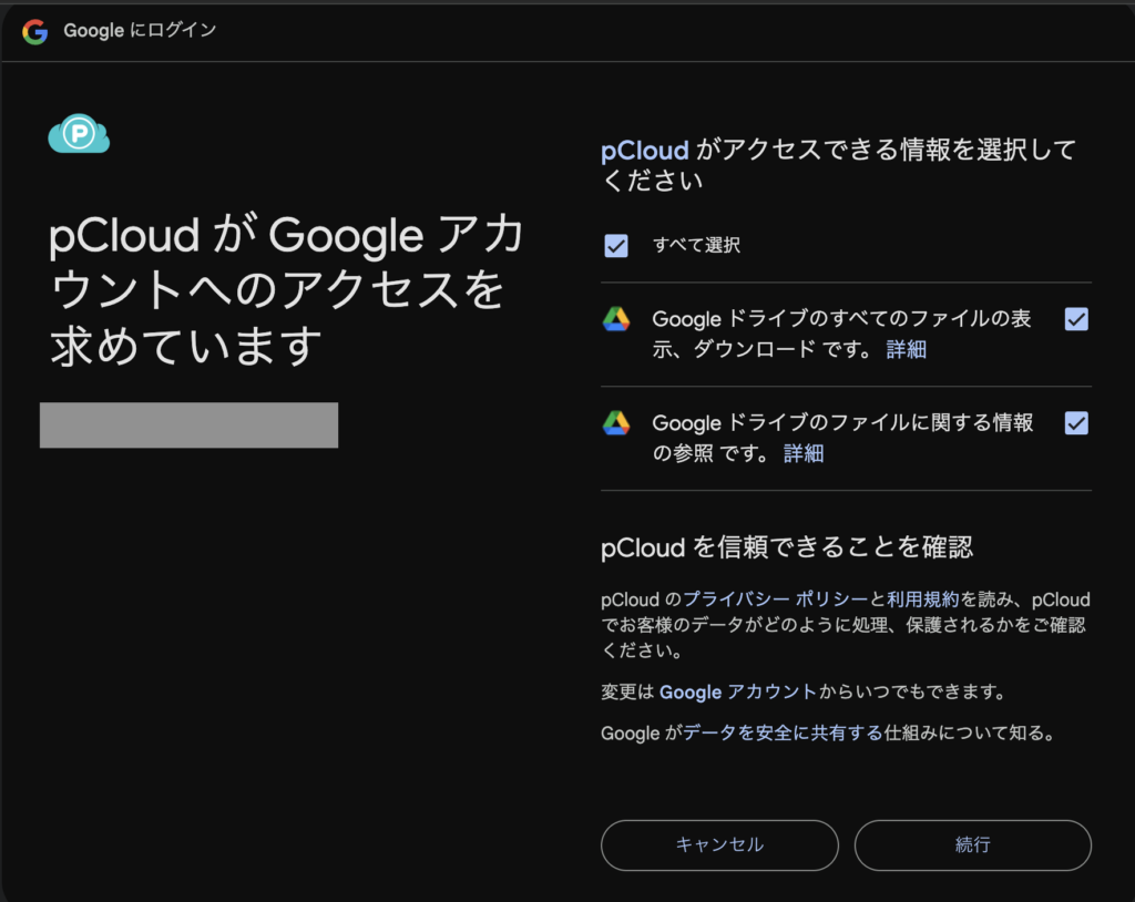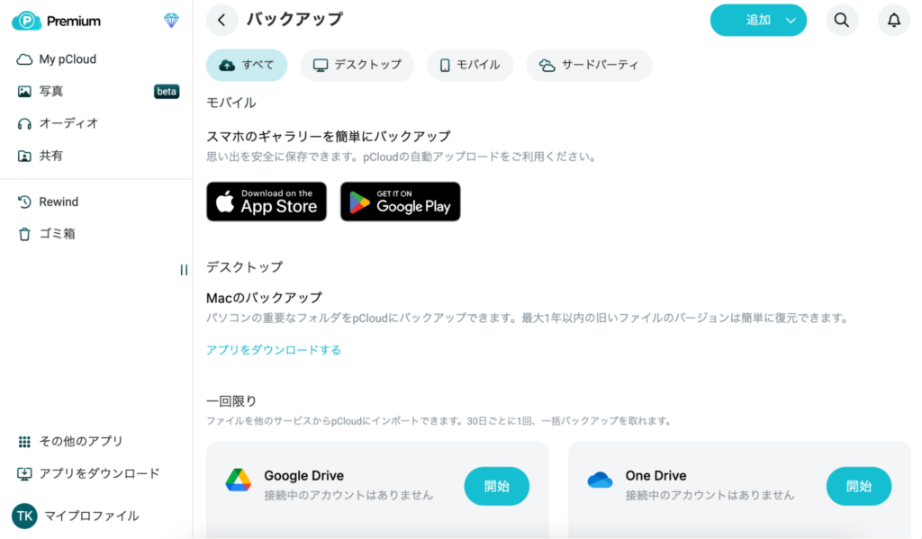 また「pCloud」は、今使っているスマホや使っているPCのデータバックアップができるのはもちろんですが、他のサービスからの移行も非常に楽ちんです。今回は試しに「Google Drive」から移行してみました。