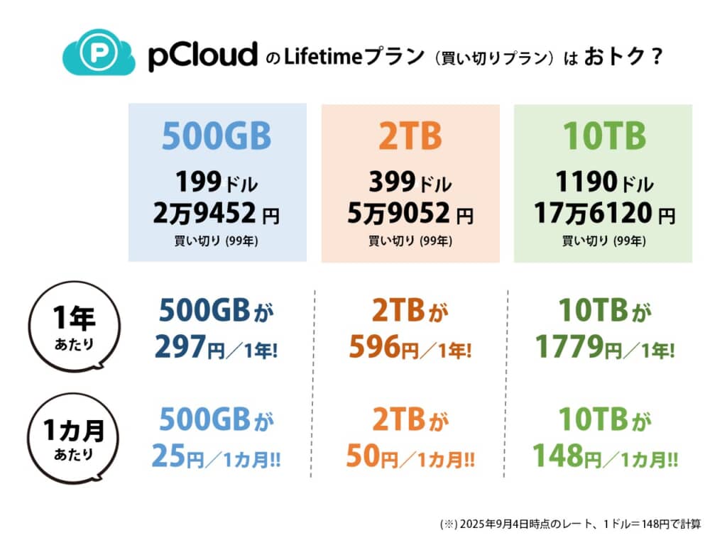 日本円にすると、500GB=2万9452円、2TB=5万9052円、10TB=17万6120円です(※)。 「Lifetime」プランは文字通り買い切ってしまえば契約者が死ぬまで使えますし、一生単位で見ればコスパが良いと言えます。
