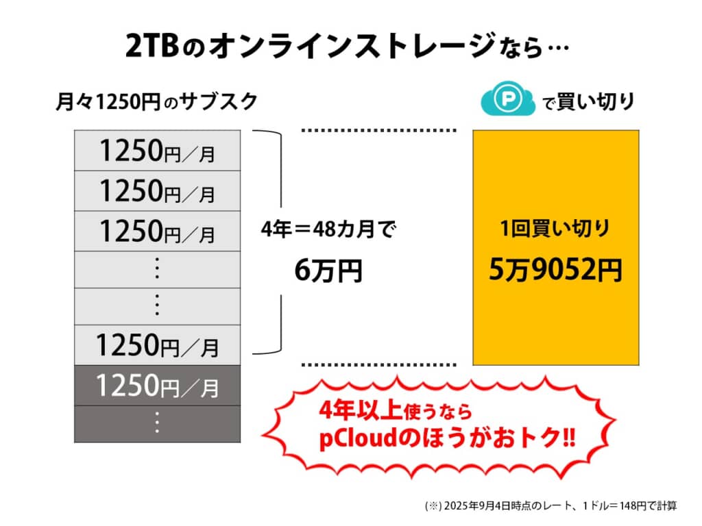 また、2TBの容量を毎月1250円で利用できるサブスクサービスがあると仮定して比較した場合、「pCloud」の2TB買い切りプランなら4年1カ月目以降「pCloud」のほうがずっとおトクになります。