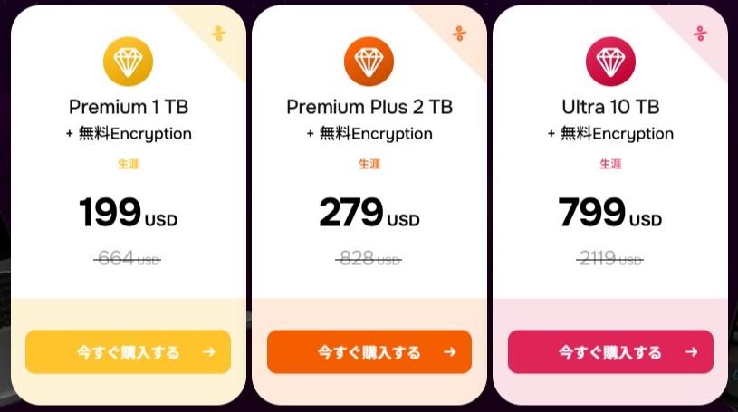 なお、ドル記載ですが日本円での購入も可能。後からサービスが値上げしても為替変動で価格が上がっても買い切りなら影響なし! 上限が足りなくなった場合は、追加購入もできるので安心です。購入した追加ストレージの容量分も一生使うことができます。