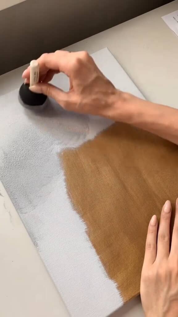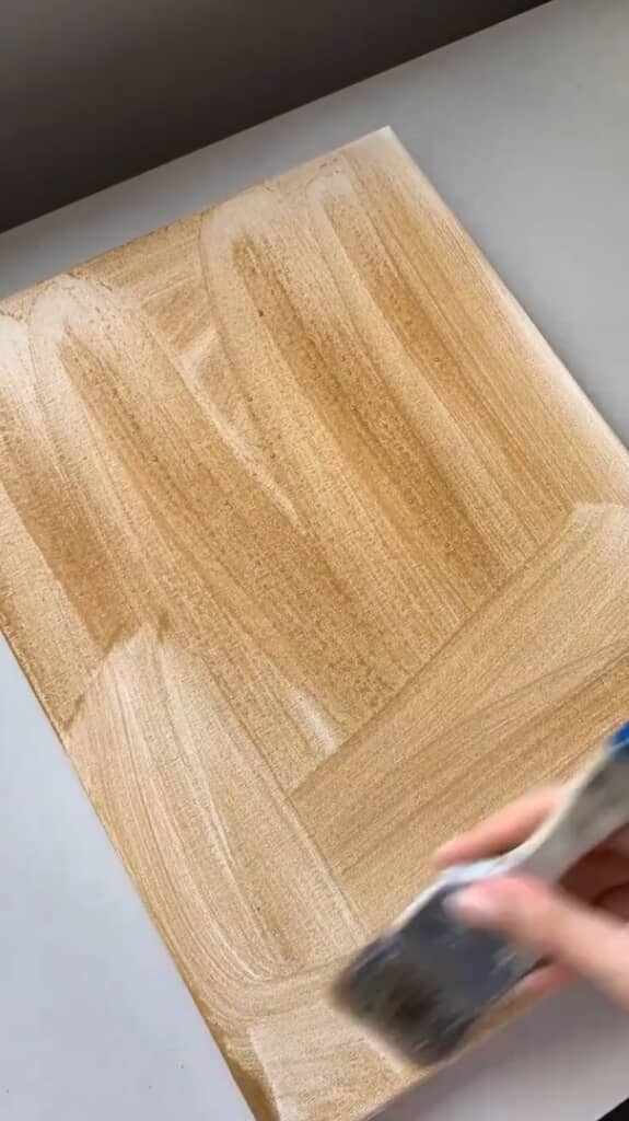 話題の動画は、最初にキャンバスを絵刷毛で茶色のような色で塗りつぶすところからスタートします。まるで木材のような色味になったかと思いきや、その上からまた白く塗り始めました。茶色に塗りつぶしてから、白く塗りつぶすのですね。