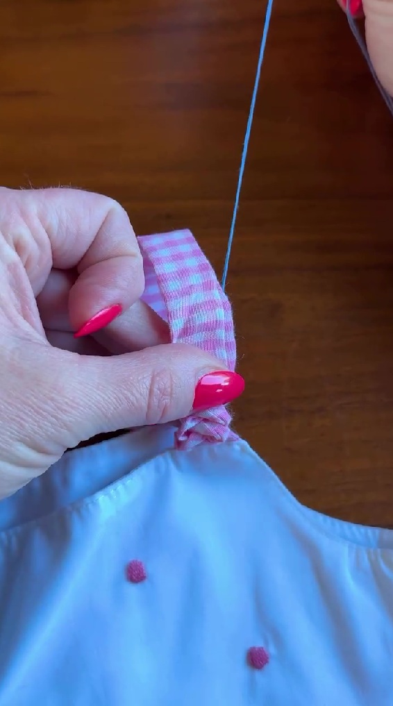 このリメイクのために用意するのは、針と糸だけ。工程もとても簡単で、肩ひもを数針ざっくりと縫い留め、縫った部分をぎゅっと絞るだけです。布が縮まってギャザーが寄り、あっという間に肩ひもの長さが調整できました。