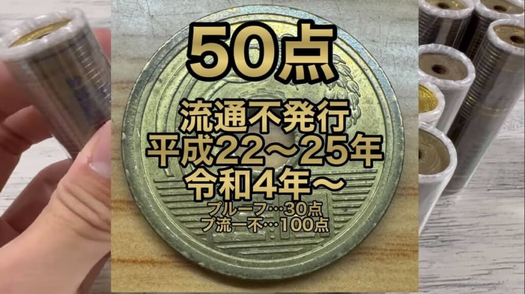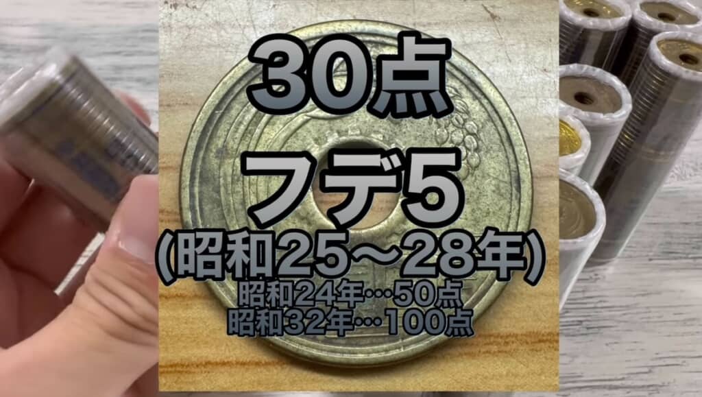 5円玉の初年号となる昭和34年、流通最小という平成21年に生産されたものはレア物とされ、現行5円玉の前身となる通称・フデ5、平成22年から25年、そして令和4年以降に生まれつつも、流通用には発行されていないものは激レアだと言います。