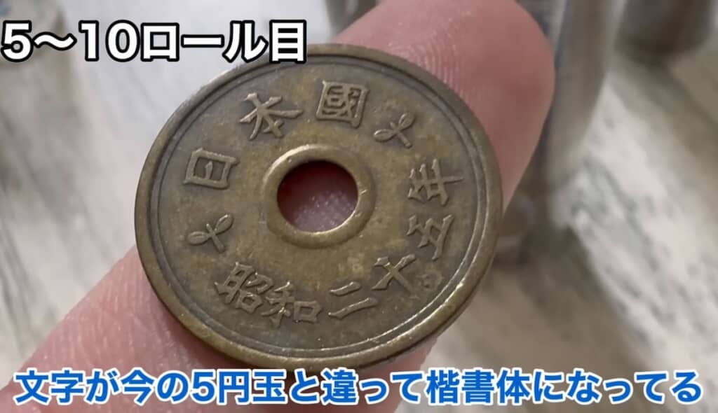 続いては昭和25年発行のフデ5も見つかり、「日本国の国の文字が國という旧字体になっています。加えて文字が今の5円玉と違って楷書体になっています。これがまじでレア」とのこと。