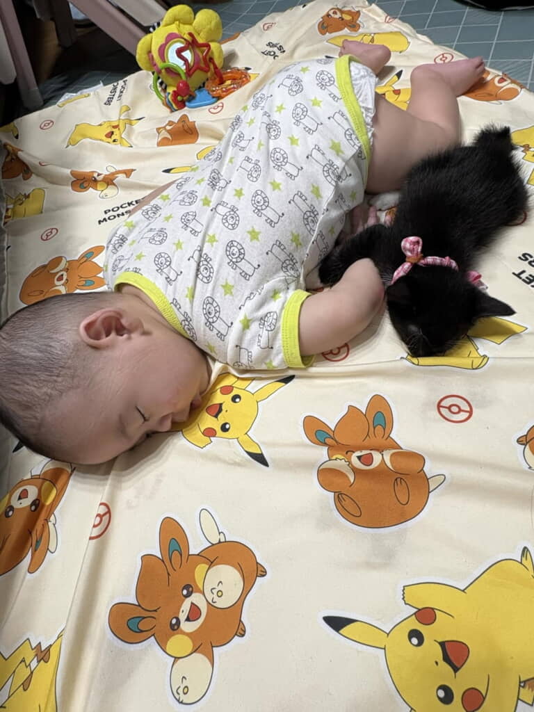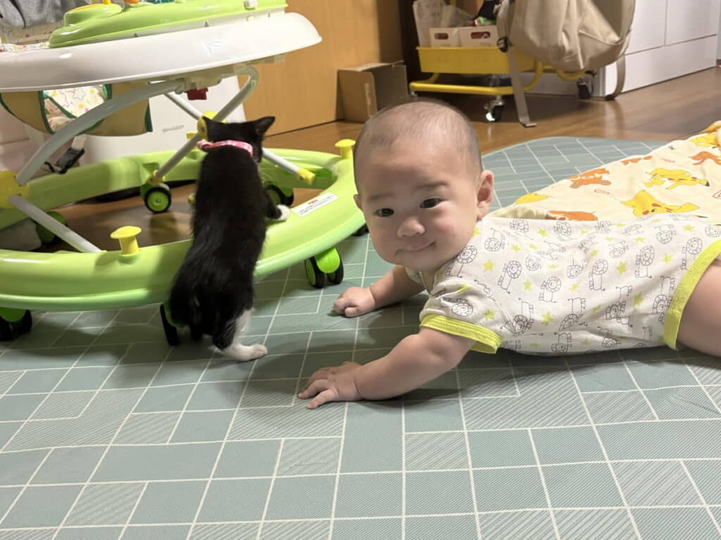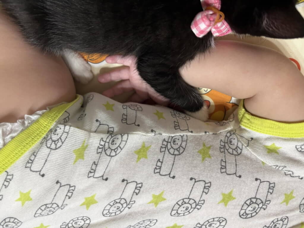 その後すぐに動物病院へ行き、無事隔離期間を終えた子猫ちゃん。すぐそばでNatsukiさんが見守る中、赤ちゃんとともに毎日のびのびと過ごしています。そうやって一緒に暮らしているうちに、赤ちゃん同士ですっかり仲良くなってしまったようです。