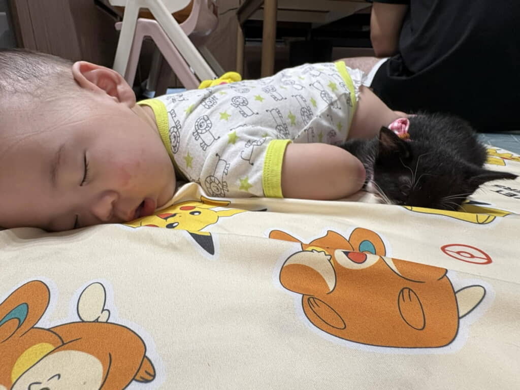 そこには、スヤスヤと眠る赤ちゃんが写っていました。安らかに眠る様子はほほ笑ましいばかりです。そしてその手のあたりに視線を送ってみると……なんとフワフワな子猫の姿が! よく見ると、赤ちゃんの手に前足を巻き付けるようにして、くっついて一緒に寝ています。