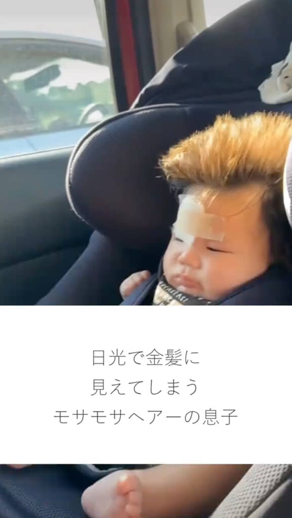 始めに映し出されたのは、日の光に当たり金髪のように見えるはるくんの姿。根本は黒く見えますが毛先がぱやぱやで透けており、さらに重力に逆らって髪が伸び大爆発! この頃はいろいろな人から「染めてる?」と聞かれママさんは少し頭を悩ませていたといいます。