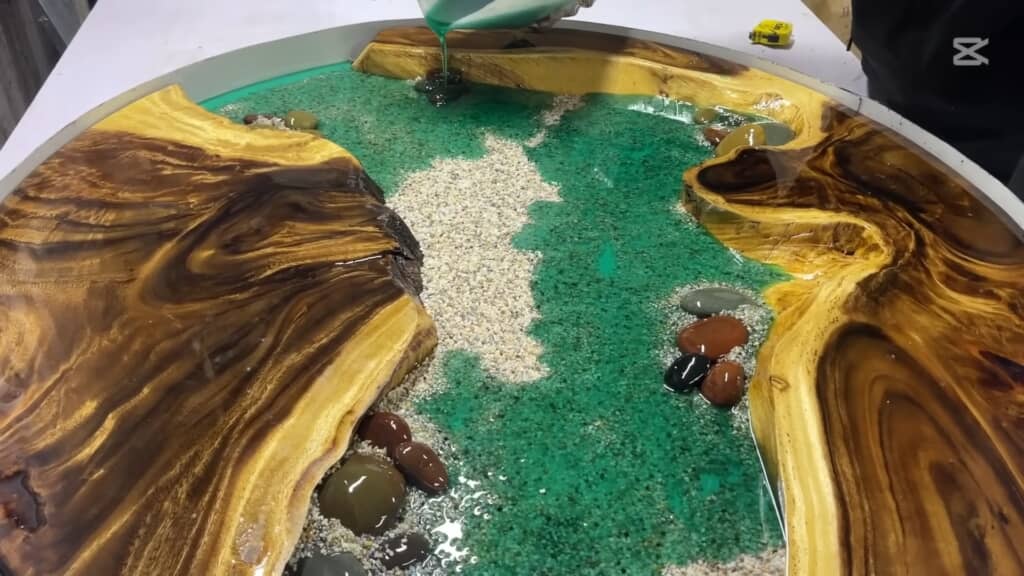 別で用意しておいた円形の型に木板を入れて、最初のエポキシ樹脂を投入。木板の表面になじませながら固まるまで待ちます。しっかり固まったことを確認したら、目の細かい砂利を敷き詰めていき、大小さまざまな石を並べて緑色に染めたエポキシ樹脂を流し込んでいきます。