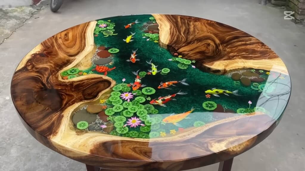 完成したのは美しいラウンドテーブル! 日本や中国などで見られる庭園をテーマに、池を泳ぐ鯉と亀を閉じ込めたようなデザインです。エポキシ樹脂ならではの透明感が美しさを際立たせますね。