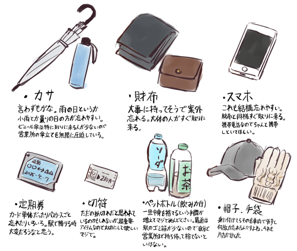 投稿者は、現役で乗務員として働いているというXユーザー・やまとじ(@yamatozi201)さん。「忘れ物とか落とし物とか結構拾うんでまとめてみた」と添えて、仕事中に見つけた「電車の忘れ物(落とし物)」をまとめたイラストを披露しました。