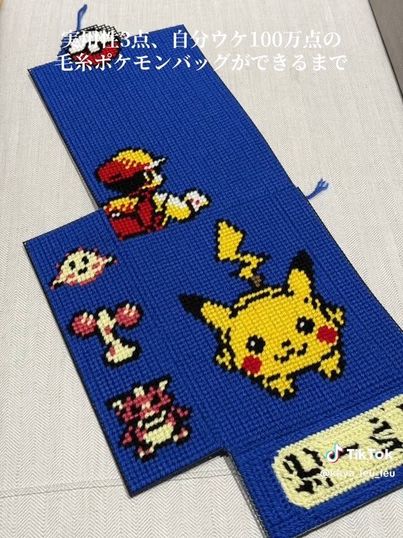 網目を1つ1つ縫う、2カ月にも及ぶ地道な作業で生まれたのは、ポケモンの小さなバッグ。どの面を見てもピカチュウやトレーナーが顔を出す、楽しげなデザインが目を引きます。