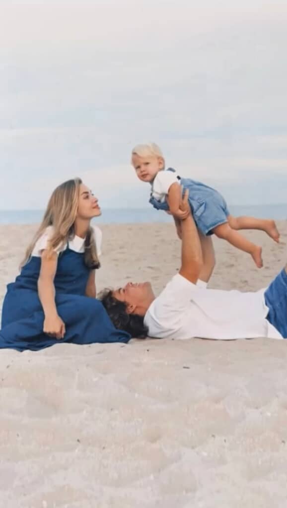 1/2)赤ちゃんを抱っこして砂浜で撮影。白Tシャツ姿の幸せいっぱいな家族写真