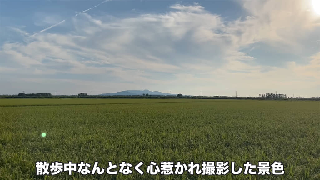 そして散歩中に何となく心が惹かれたママが、青い空と緑の絨毯が広がる景色を撮影すると……左下の辺りに「緑色の玉」が映り込んでいました。