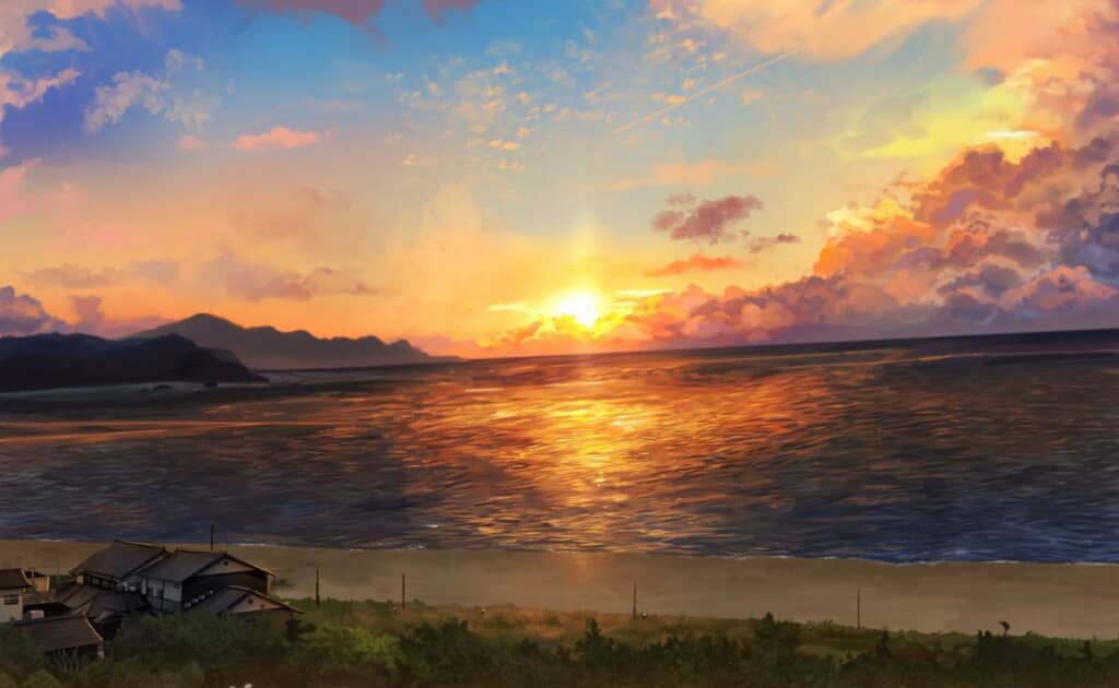 そして、2枚目の仕上がりは……。夕日の雰囲気が本物そっくりで、まるで写真かと見間違えてしまうほどです。手前の家や奥の山々、雲の間に沈む夕日という、ちょっぴり寂しそうな雰囲気の夕暮れ時の光景が細部までていねいに描かれています。カブトさんによると、海の波と色味にこだわったとのことです。