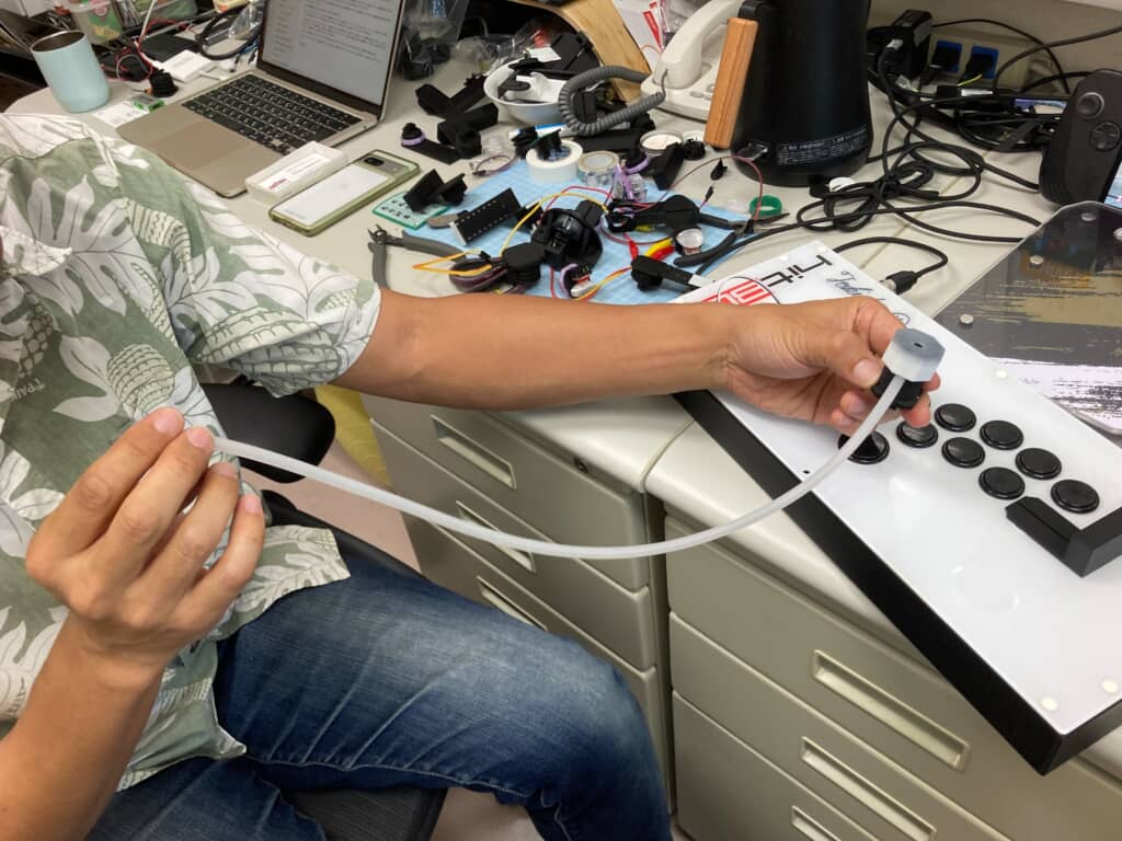 「栗原式インパクトボタン」(画像右端)は指先で押すのではなく、手全体を動かして押せる