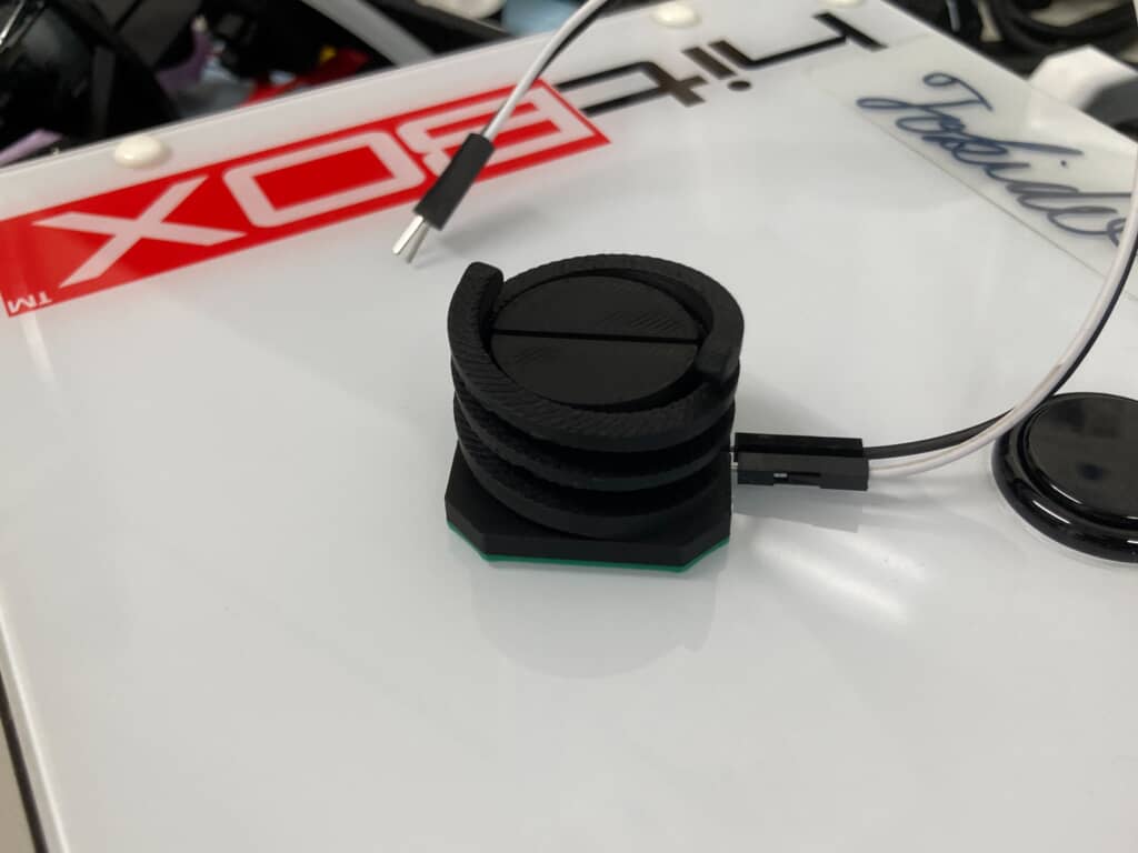 渦巻き型のボタンデバイス。上から押すだけでなく握り込むようにも使える