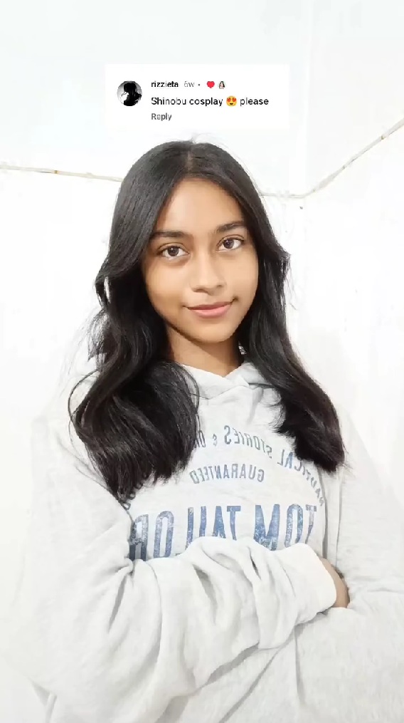 今回ご紹介するのは、投稿者さんが『鬼滅の刃』の胡蝶しのぶのコスプレをする動画です。最初は、シンプルな白のパーカー姿でカメラに向かって微笑む投稿者さんの姿が映されます。まだコスプレ要素はなく、あくまでも素の姿が映し出されています。そこに「胡蝶しのぶのコスプレをお願い!」というコメントが添えられており、ファンからのリクエストをきっかけに変身劇が始まりました。