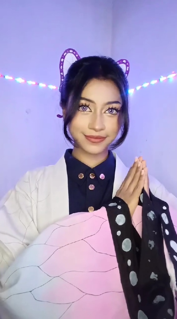 次のシーンに移ると……胡蝶しのぶの装いを身につけた姿に変身! 白から淡いピンクにグラデーションがかかった蝶の羽をイメージさせる羽織の袖、黒地に水玉模様が施された袖口、そして黒い隊服に金色のボタンなど、衣装の細部まで整えられており、作品へのリスペクトが感じられます。