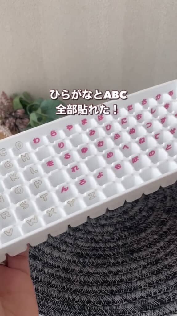 文字シールを製氷器の側面に貼っていきましょう。ひらがなは「あいうえお」順に、アルファベットは「ABC」順に貼ると……なんとこれだけで、文字をマッチングさせて遊ぶ知育玩具の完成です。