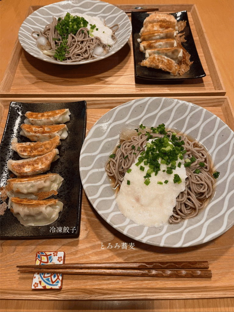 2日目には、手羽元のさっぱり煮やみそ汁などの5品が並び、フルーツも添えています。その次の日にはとろろそばと餃子という、夏の夜にぴったりなメニューが並んでいます。