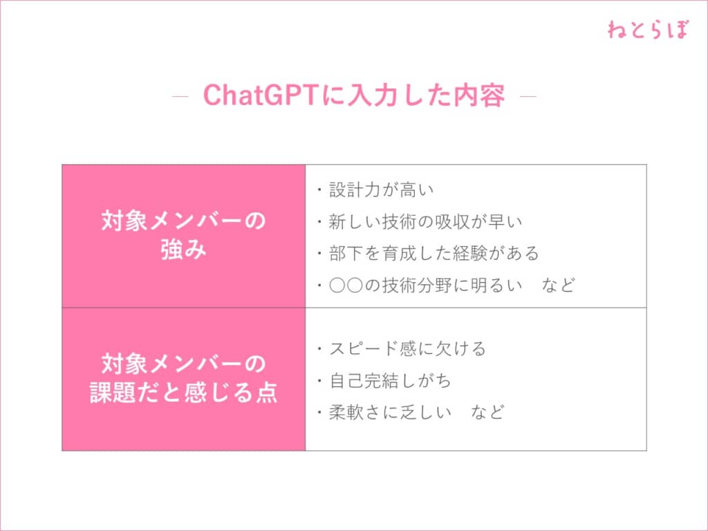 入力したのは「対象メンバーの強み」と「課題だと感じる点」です。