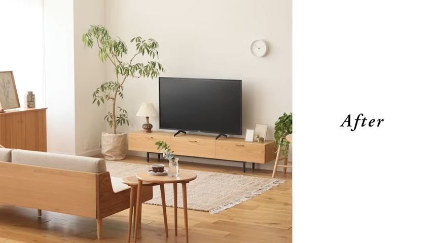 できあがったコーディネートでは、テレビの横にテーブルライト、フォトフレームとオブジェの組み合わせ、テレビボードのサイドに植物やスツールを配置し、床にはラグマット、キャビネットやサイドテーブルにも小物やアートを置いています。「大きな三角形でテレビをフォーカルポイント(よく目に入る場所、見どころ)に」「テレビを中和する素材感コーデ」がテーマとのこと。