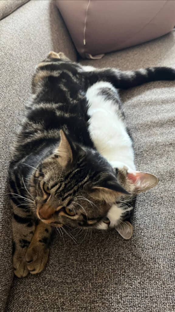 普段の投稿を見ると、キリくんは太っているわけではなく標準的な体形です。カメラに映っていたときは、画角や寝方などさまざまな要素が重なり奇跡の1枚のような構図になっていたのかもしれません。