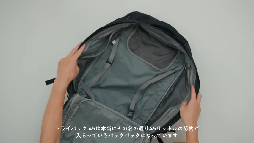 45という名称から分かる通り、バックパックの容量は45リットル。メインとなる収納スペースは、ぐるっと回り込むジップで、荷物を詰めやすくて取り出しやすい仕様になっています。幅広な作りになっているので、カメラ・レンズのケースやガジェットを梱包箱ごと入れることもできちゃいます。