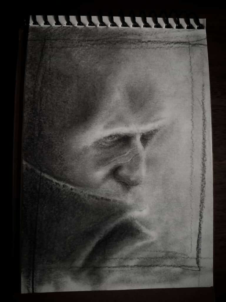 「写真では伝わりきらん……」とTomさんは、続けて「こう見えたんだけど」と1枚の絵を投稿。そこには、深い眼差しで前方をにらむ「年配の男性」のように見える横顔が。わずかに湾曲する鼻には2本の傷があり、口元は立ち上がった上着の衿で隠されています。これは、ド迫力……!