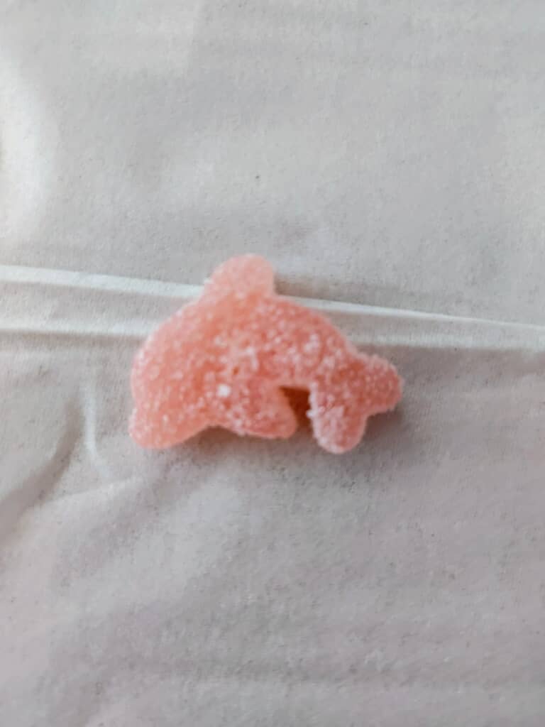 なんと、イルカ形のピュレグミでした。「ピュレグミ食べてたらイルカの形の出てきた」と投稿に2枚の写真を添えたMayuさん。ピンク色のイルカが、ちょうどジャンプをしているように丸まっているみたいに見えますね。