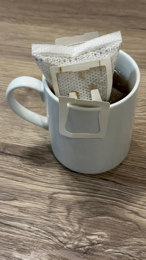 さちこさんが見たものは、ドリップバッグを取り出すまでは出来たようですが、それをそのままカップに入れたお湯にどっぷり浸した状態になっているコーヒー(?)でした。