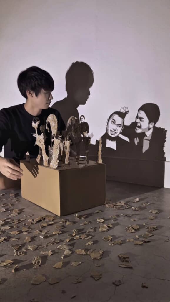 今回はお笑いコンビ「千鳥」のふたりを影絵で再現。ステージに上がってマイクの前に立ち、いまからネタを披露する瞬間を切り取ったような作品で、箱の上に立てられたダンボール紙の影で見事に表現しています。