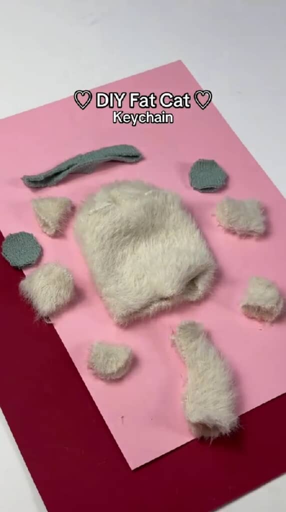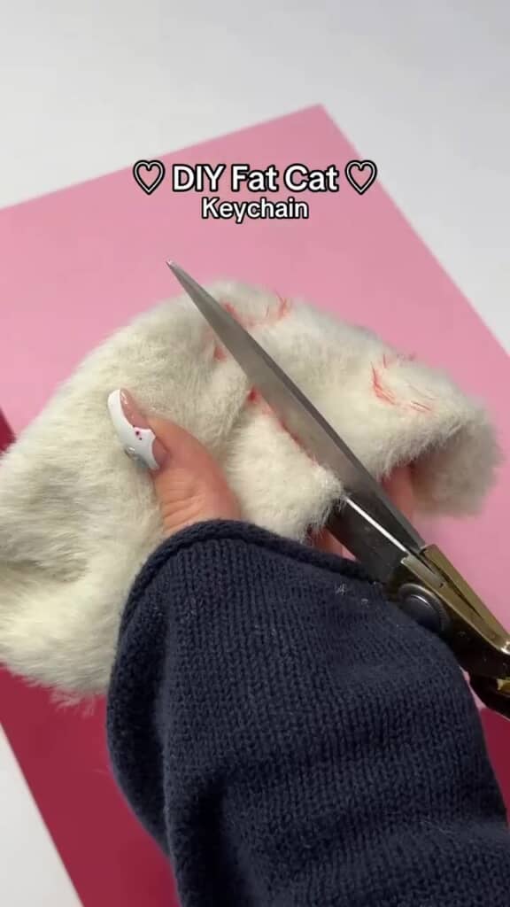 今回ご紹介するのは、モコモコの靴下を切って縫い合わせるだけで、かわいい猫のキーホルダーが完成するDIY動画です。動画は、白くやわらかなモコモコ靴下を机の上に広げるシーンから始まります。手にした赤いペンでラインを書き、ガイドに沿ってハサミを入れていきます。