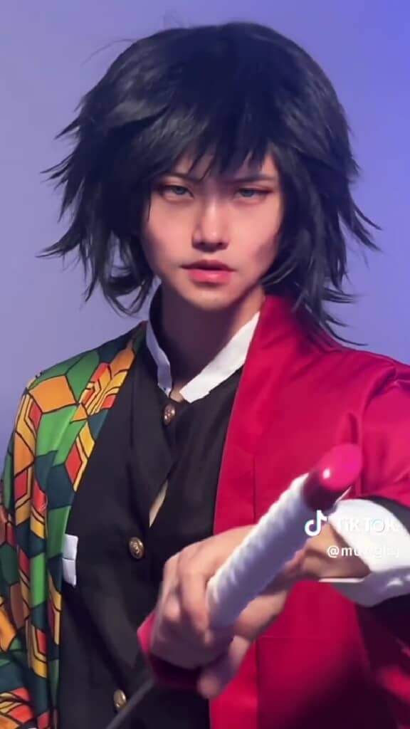 羽織は冨岡義勇の代名詞ともいえる左右非対称の柄が鮮やかに再現され、黒を基調とした隊服とのコントラストが際立ちます。さらに手には刀を携え、ポーズを決める姿は迫力満点。ライトの当たり方や背景演出も工夫されており、動画全体の完成度の高さがうかがえます。
