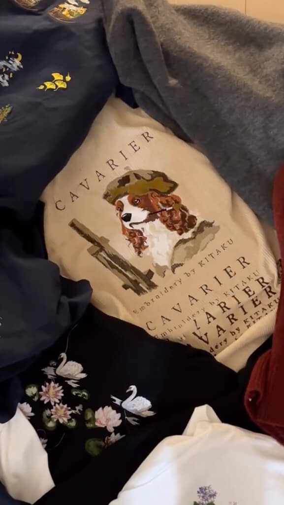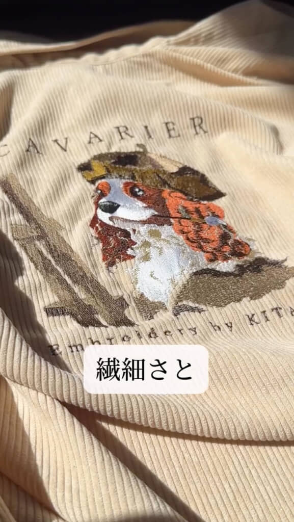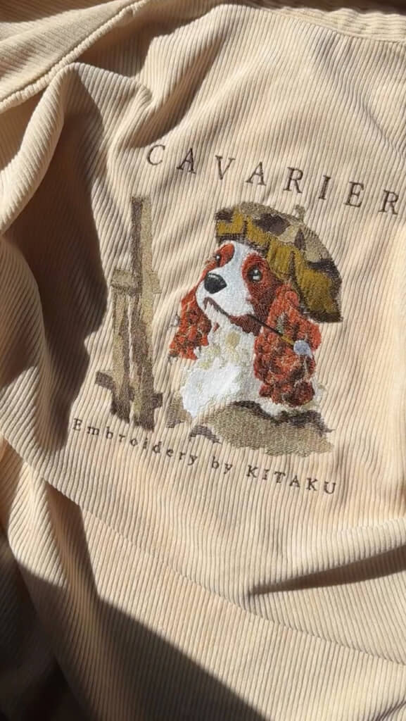 今回は、50時間かけて制作したという刺しゅう作品を紹介。テーマは「芸術の秋」ということで、あたたかみのあるベージュのコーデュロイシャツに繊細で優雅な雰囲気をもつキャバリア(キャバリア・キング・チャールズ・スパニエル)を刺しゅうしました。