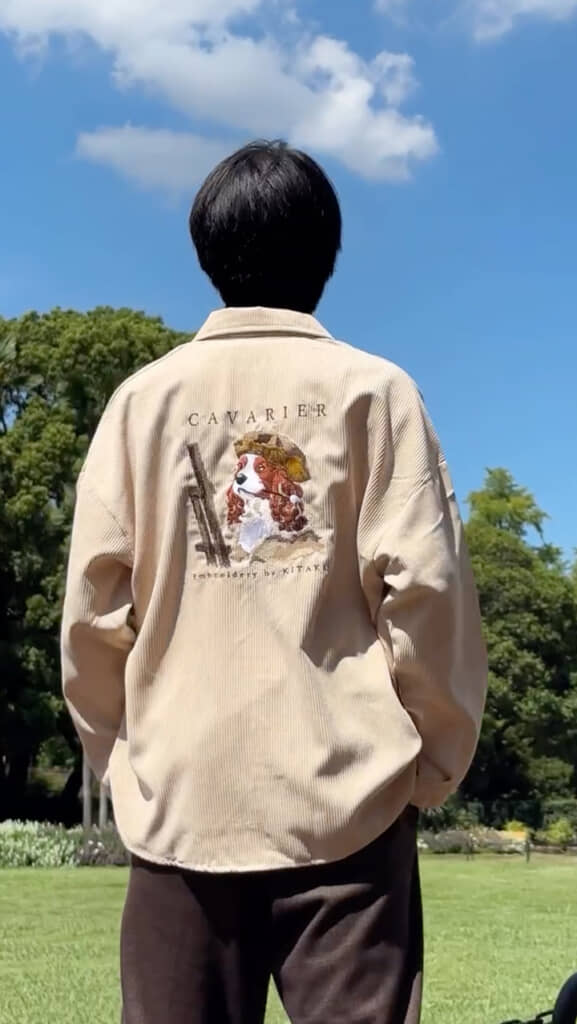 完成したのは、イーゼルの前でベレー帽をかぶり、口に筆をくわえたキャバリアの刺しゅうです。秋らしい色合いでコーデュロイシャツの質感と相性バッチリ。背中に大胆に刺しゅうされた芸術家気分のキャバリアがとても目を引きます! なお、背中にこれだけ大きな刺しゅうを施したのは、これが初めてだったとのこと。