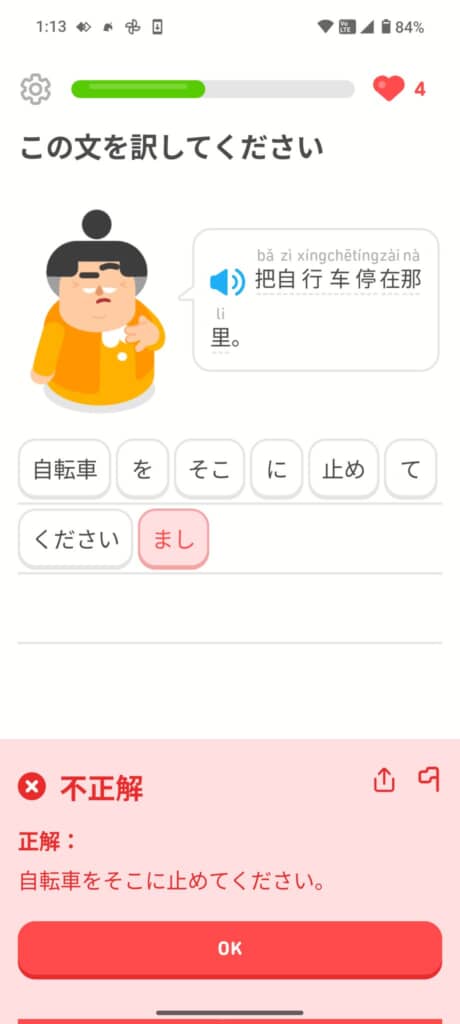 アプリが提示する正解は「自転車をそこに止めてください」となっていて、「自転車をそこに止めてくださいまし」では不正解になるもよう。しかし、間違っているわけでもなく、ちょっとDuolingoに物言いをつけたくなる結果となりました。日本語って難しいですね。